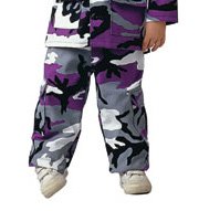 Rough and tough BDU fatigues now come in purple! These BDUs are great for active outdoor use, purple school spirit, purple teams, dance troupes with Attitude, purple-loving Kids, or your little gothic Baby Bat.